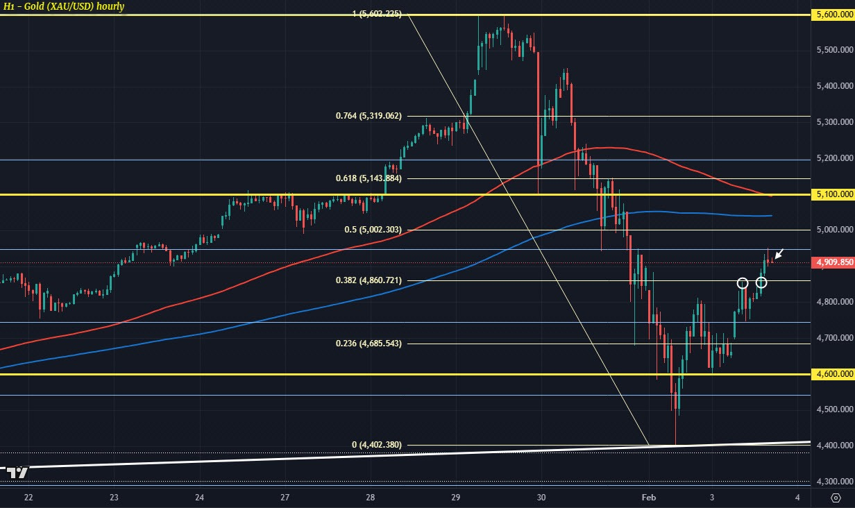就黄金而言,逢低买盘正逐步打断此前的下跌动能,价格回到并站上38.2%斐波那契回撤位4,860美元上方。这带来一定程度的安慰,市场关注点转向5,000美元关口——该位置大致相当于将上周以来的急跌“收复一半”。