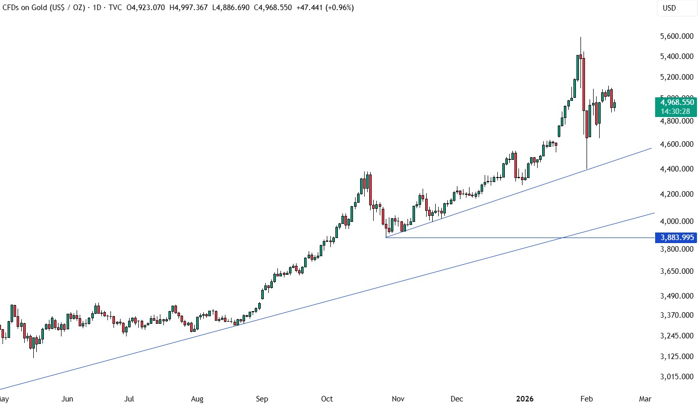 周四金价下跌约3%,跌至近一周低位,并跌破5,000美元/盎司这一关键支撑位。当天在股市大跌后抛压加剧,触发黄金走弱。