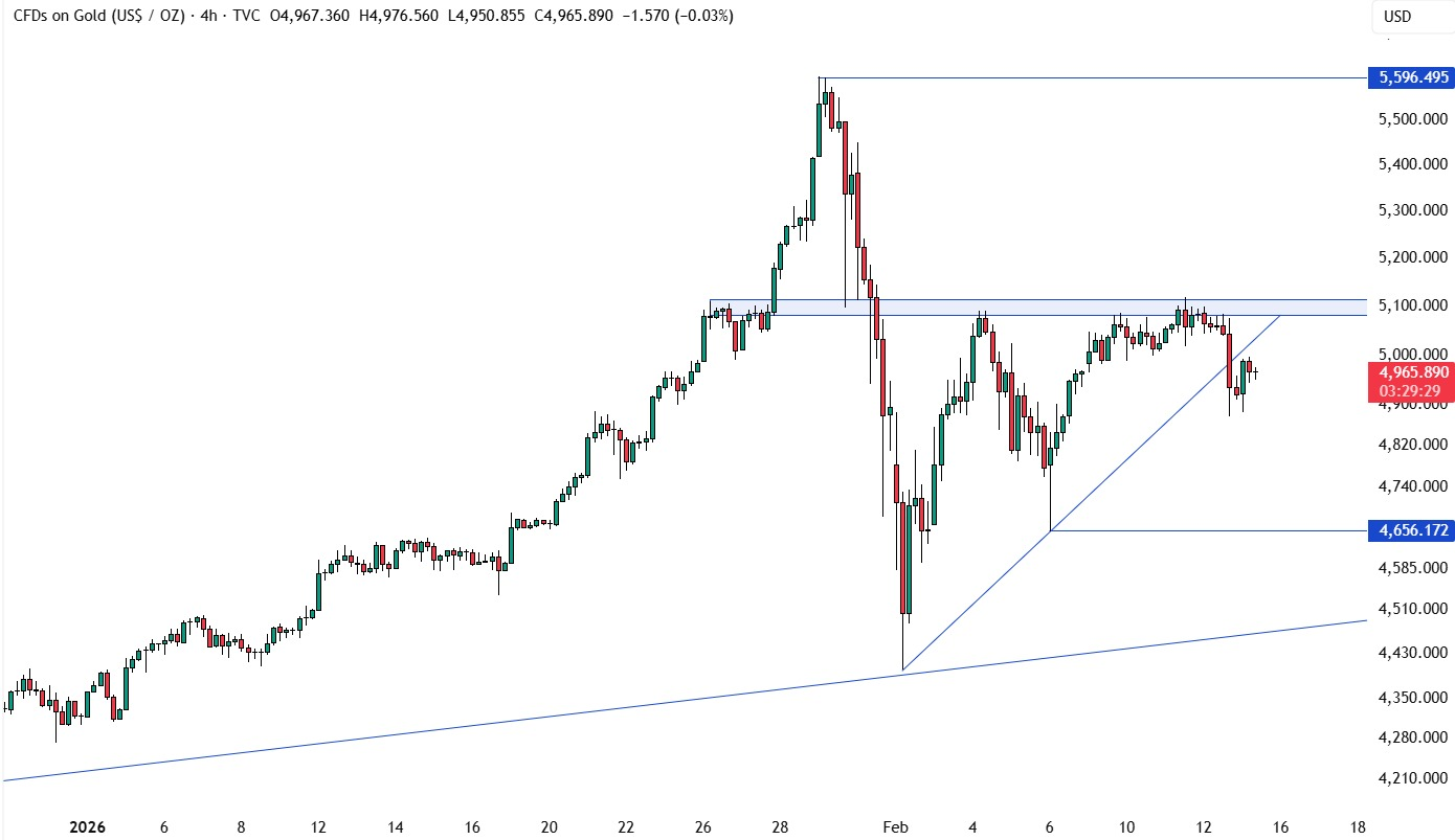 4小时图显示,5100附近存在强阻力,过去数周价格多次在该区域受阻回落。作者指出,周四价格跌破上升趋势线,可能是下行延续的信号。破位后空头加仓,目标指向4656。若价格回抽已跌破的趋势线,空头可能在阻力附近再度介入,并把止损设在阻力上方,以博弈进一步下探并创出新低。多头则希望看到价格有效站上该阻力位后再跟进,押注上行并再度挑战历史新高。