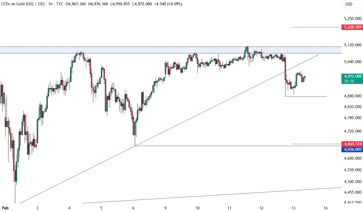 1小时图上,关注近期低点4878。若跌破4878,空头动能可能加速,更多卖盘可能加入,抛售幅度或扩大。红线用于标示当日平均波动区间。