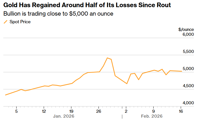 FX168财经报社(亚太)讯 周一(2月16日)国际黄金价格下跌,交易员在温和的美国通胀数据推动金价重新站上5,000美元后获利了结。