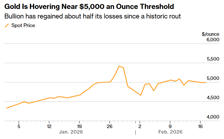 FX168财经报社(亚太)讯 周二(2月17日)国际黄金在亚市早盘交易中基本持平,因亚洲多地正值农历新年休市,同时美国周一也因假期休市,市场交投清淡。现货黄金徘徊在5,000美元附近。此前一个交易日金价下跌1%,收在5000关口下方,最终收...