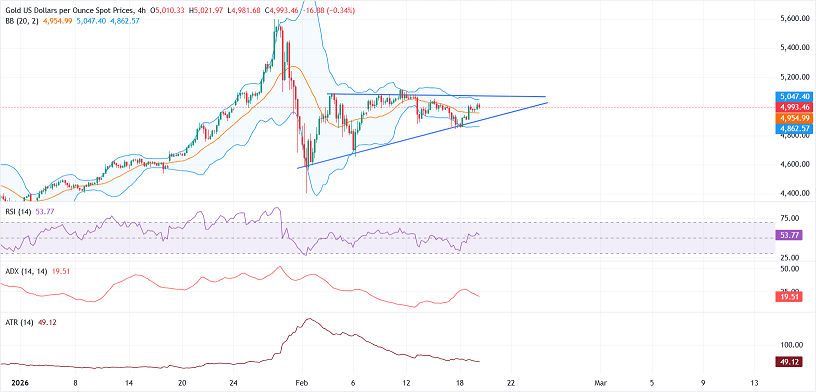 FXStreet分析师Vishal Chaturvedi指出,从技术角度来看,4小时图显示黄金价格维持在20周期简单移动平均线(SMA) 上方,该均线也构成布林带中轨(位于4954美元/盎司附近),从而维持了短期温和支撑。