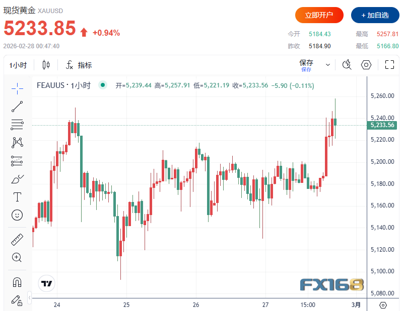 金价周五维持在高位震荡,现货黄金刷新日高至5257.81美元/盎司,日内涨幅达超1%。
