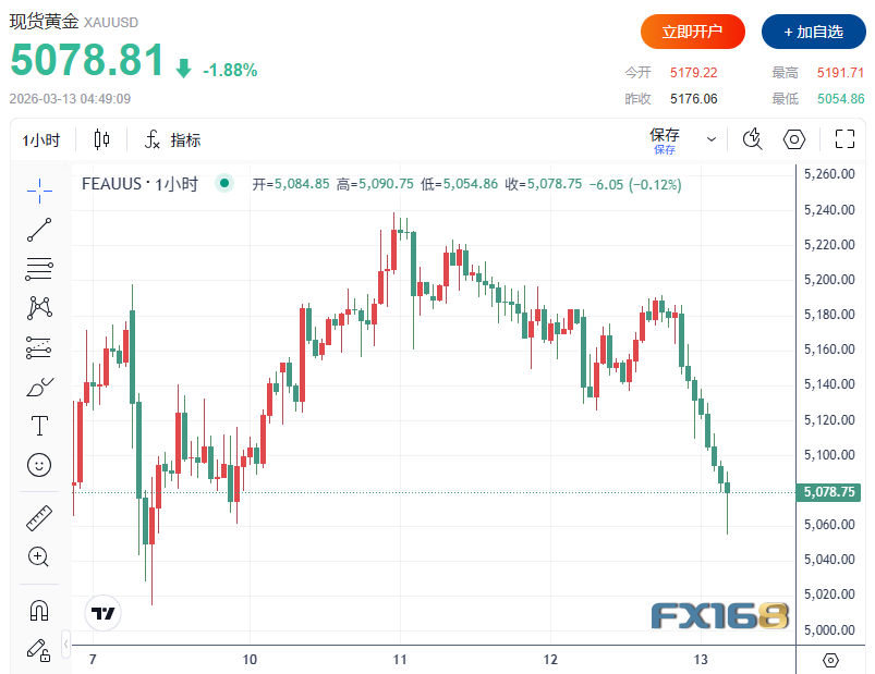 FX168财经报社(北美)讯 尽管美国与以色列对伊朗发动新一轮打击、中东局势持续升级,但作为传统避险资产的黄金,这一次并未走出市场预期中的强势行情。黄金在2月28日冲突爆发后短暂上涨,但很快回吐涨幅。进入最新一轮冲突的第二周后,金价整体仍维持区间震荡,显示避险逻辑正受到美元走强、美债收益率上升以及流动性压力等多重因素掣肘。