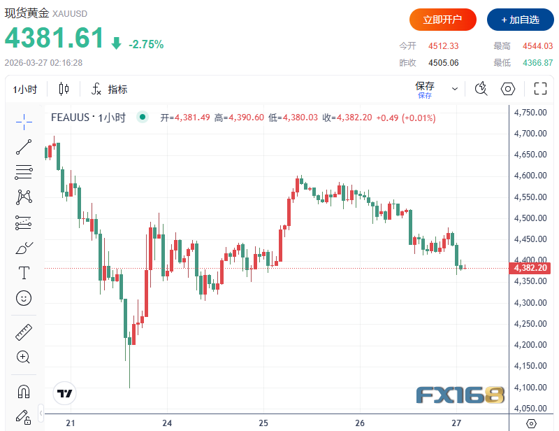FX168财经报社(北美)讯 周四(3月26日),黄金价格震荡回落,结束此前两连涨走势。美市盘中,现货黄金(XAU/USD)持续走低并刷新日低至4366.87美元,日内下跌约150美元,较周三触及的4602美元高位明显回落。