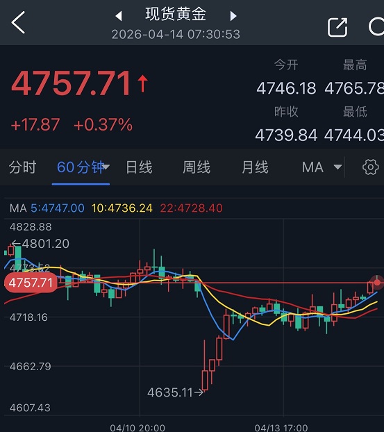 截止周一收盘,现货黄金价格报4739.84美元/盎司,日内跌幅缩减至0.18%。