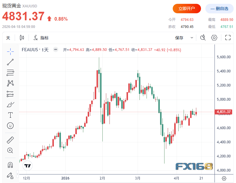 周五美市尾盘,现货黄金收盘上涨0.85%,报4831.37美元/盎司,较日内稍早触及的4889.50美元/盎司高点回落。
