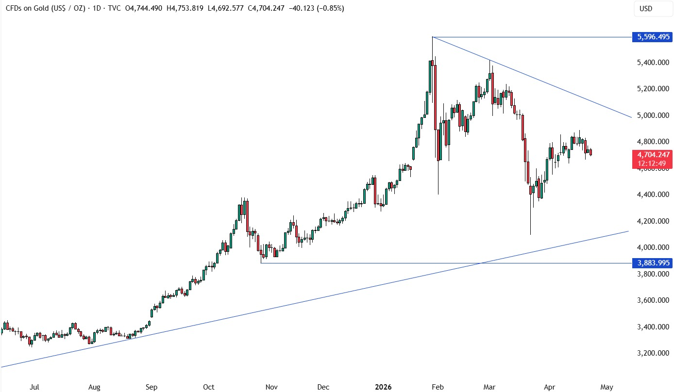 在日线图上可以看到,黄金目前只是处于整理状态,等待新的催化因素将价格推向任一方向。眼下,金价基本仍运行在本月初附近的同一区域。对多头而言,自然的目标应是位于 5000 附近的下行趋势线。如果价格涨到那里,预计空头会依托这条趋势线、并在其上方设置明确止损,布局回落至位于 4100 附近的主要上行趋势线。而多头则会关注价格能否向上突破,一旦突破,将加码看涨押注,目标指向下一阶段的 5400 水平。