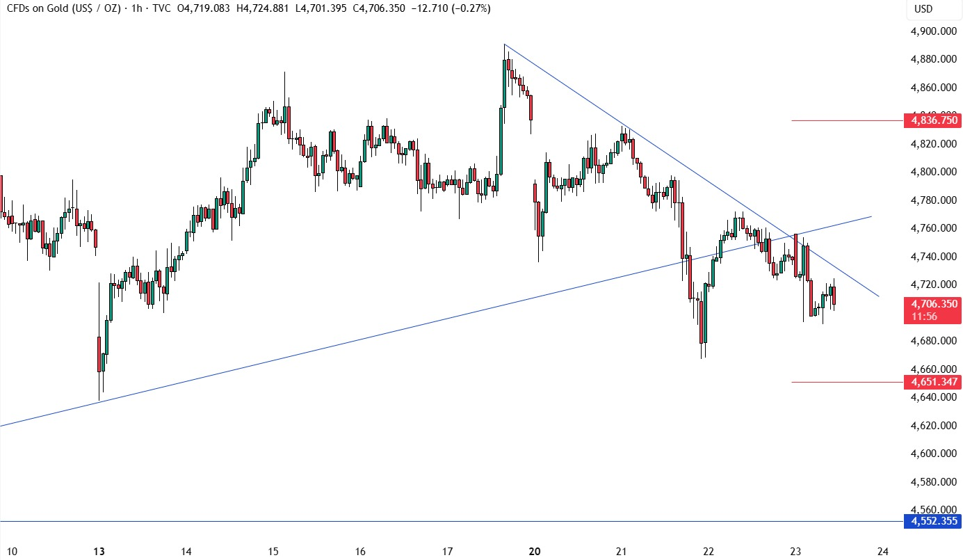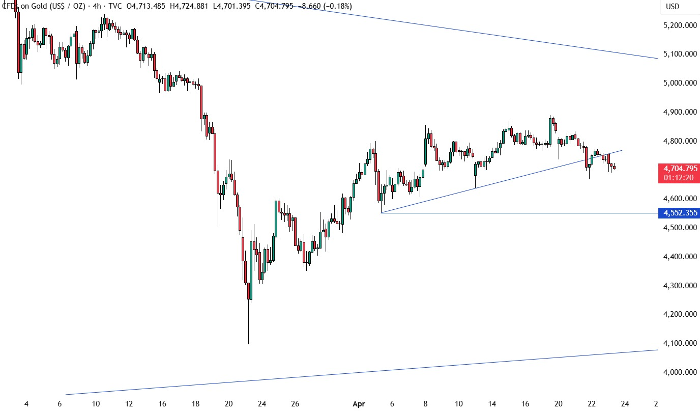 在4小时图上可以看到,价格已经跌破了一条上行趋势线,从而为更大幅度的回调打开了空间,目标可能指向 4550 一线。如果价格跌至该水平,预计多头会在该位置介入,并以下方设定明确止损,布局反弹至主要的下行趋势线。相反,空头则会关注价格是否进一步跌破,以加大看空押注,瞄准新的低点。