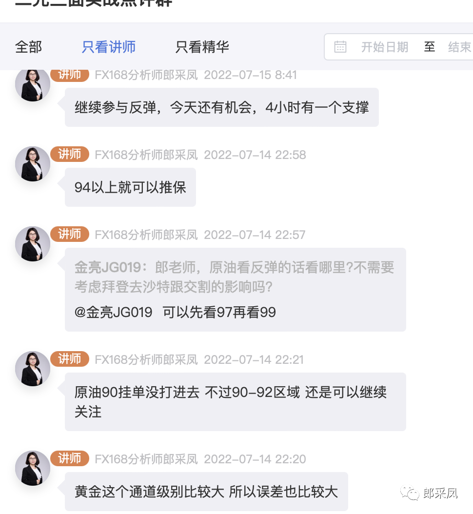 上周专栏中提到,郎采凤22.07.13:原油再度千点下跌后,下方看向90-92原油空单下行目标看向90-92区域,之后我们也着重关注了价格在90-92区域的反弹,94之上推保,上看99附近。周五价格回踩94.20-95.20区域给到再次入场的机会,周五价格抵达99附近时提到了99.40-100.40区域的减仓离场机会。整个节奏还是比较好的。