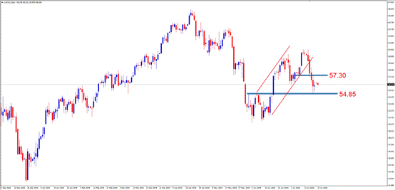 交易策略:建议投资者可考虑57.30附近做空,止损58.20附近,目标55.00附近。