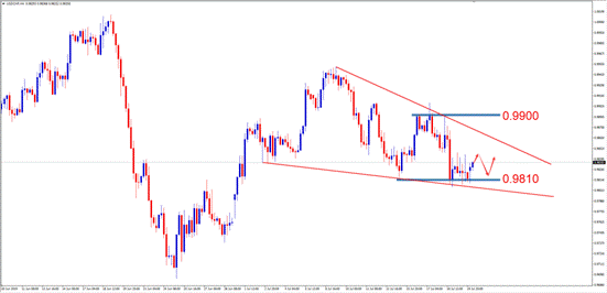 交易策略:激进的投资者可考虑0.9820附近做多,止损0.9780附近,目标0.9900附近。