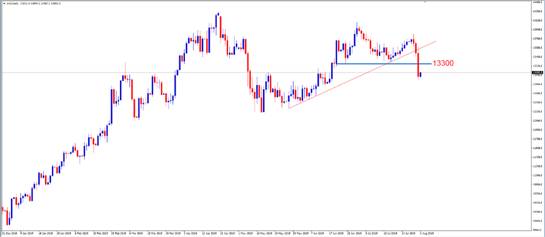 技术点评:D1周期中,A50跌破上升趋势线支撑,后市续跌风险较大,可关注反弹高空机会。
