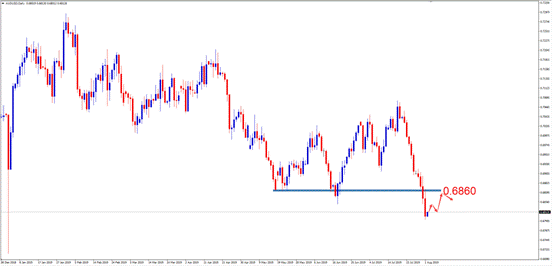 交易策略:激进投资者可考虑于0.6860附近做空,止损于0.6920附近,止盈0.6800附近。