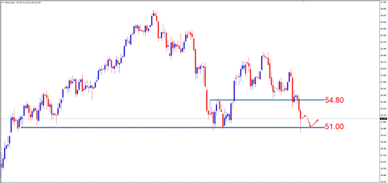 技术点评:D1周期中,价格跌破关键支撑带,市场弱势格局不变,短期价格再次测试51.00关口支撑效果。