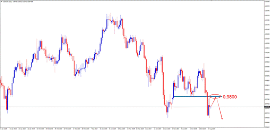 交易策略:建议投资者可考虑0.9800附近做空,止损0.9850附近,止盈0.9700附近。
