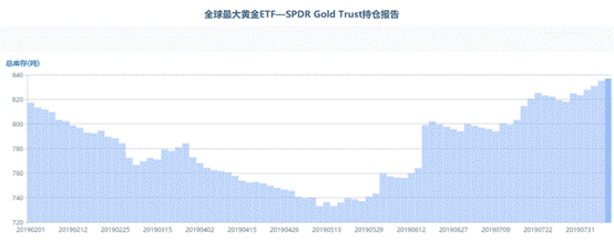 CFTC商品类非商业持仓报告显示,从2019年5月开始,黄金净仓位呈多头稳步增长,七月以来则稳定在25万的高位附近。与此同时,全球最大的黄金ETF-SPDRGoldTrust的持仓总库存,也在今年5月悄无声息的之间增加,一度从733.23吨增持至845.45吨,超越2019年初高点。众所周知,ETF持仓和CFTC持仓报告是黄金中长线交易的风向标。在市场多头情绪高涨的时候,黄金未来继续走高的几率已然很大。