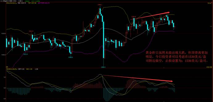 艾德证券期货研究部:目前来看亚洲股票市场已经企稳,欧洲今日开盘走高,股指如果不出现大幅的下跌,黄金极有可能会出现一次较大幅度的调整,COMEX12月期货黄金一小时高位顶背离显现更加明显,多头需要警惕,今日投资者可以考虑在1530美元/盎司附近做空,止损设置为:1536美元/盎司。
