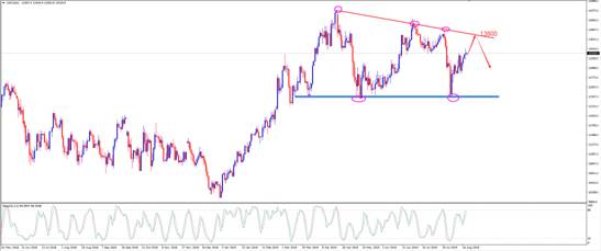 技术点评:D1周期显示,A50处于高位整理区间内,水平支撑处于12400附近,价格高点逐次降低,构筑下降趋势线。