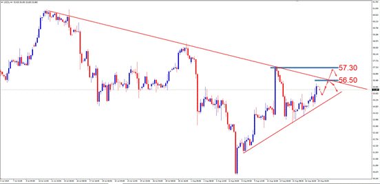 交易策略:激进投资者可尝试于56.60附近做空,止损57.60附近,止盈55.00附近。