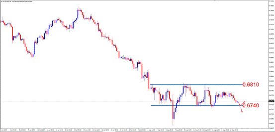 技术点评:H4周期中,澳美保持0.6740至0.6810区间宽幅震荡,大周期依然保持空头,本周可考虑逢高做空思路。
