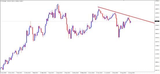 技术点评:D1周期中,A50精准测试下降趋势线后迅速回落,后事大概率在趋势线压制下保持空头走势。