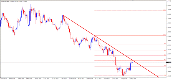 技术点评:D1周期中,英镑依然处于空头格局当中,但当前价格触底反弹,今日大概率测试斐波那契38.2%回调位。