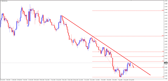 技术点评:D1周期中,英镑依然处于空头格局当中,但当前价格触底反弹,当前价格正测试斐波那契38.2%回调位于下降趋势线双阻力位。