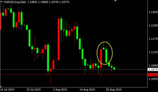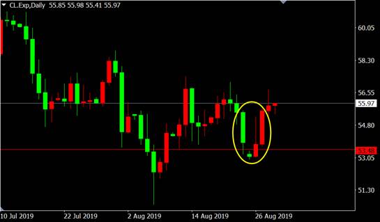 从WTI原油日线图来看价格再次回到前期支撑区,说明空方力度逐渐减弱并出现看涨吞没K线形态,多单可以考虑介入。