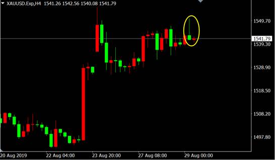 从国际黄金4小时图来看,价格上涨至前期高点附近出现上吊线看跌K线形态,行情将延续震荡趋势。