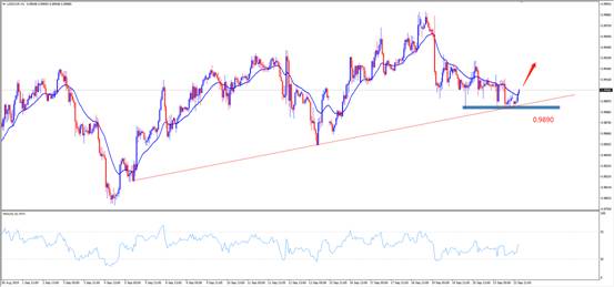 交易策略:激进的投资者可考虑0.9890-0.9960区间高抛低吸,止损50点左右,止盈70点左右。