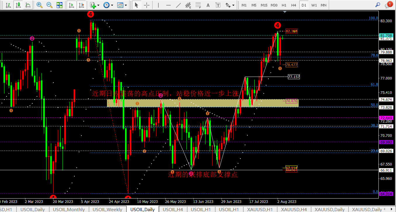 2. 日线当前上方抛物转向点*在82.4一线,支撑于均线MA5和MA10附近对应支撑81.4和80.4一线,因为昨日的大幅上涨,所以笔者认为今日回撤倒80.4附近应该是没有太大问题。日线指标macd高位金叉震荡,但是灵动指标sto向下修复,所以日内并没有太强的上冲动能。