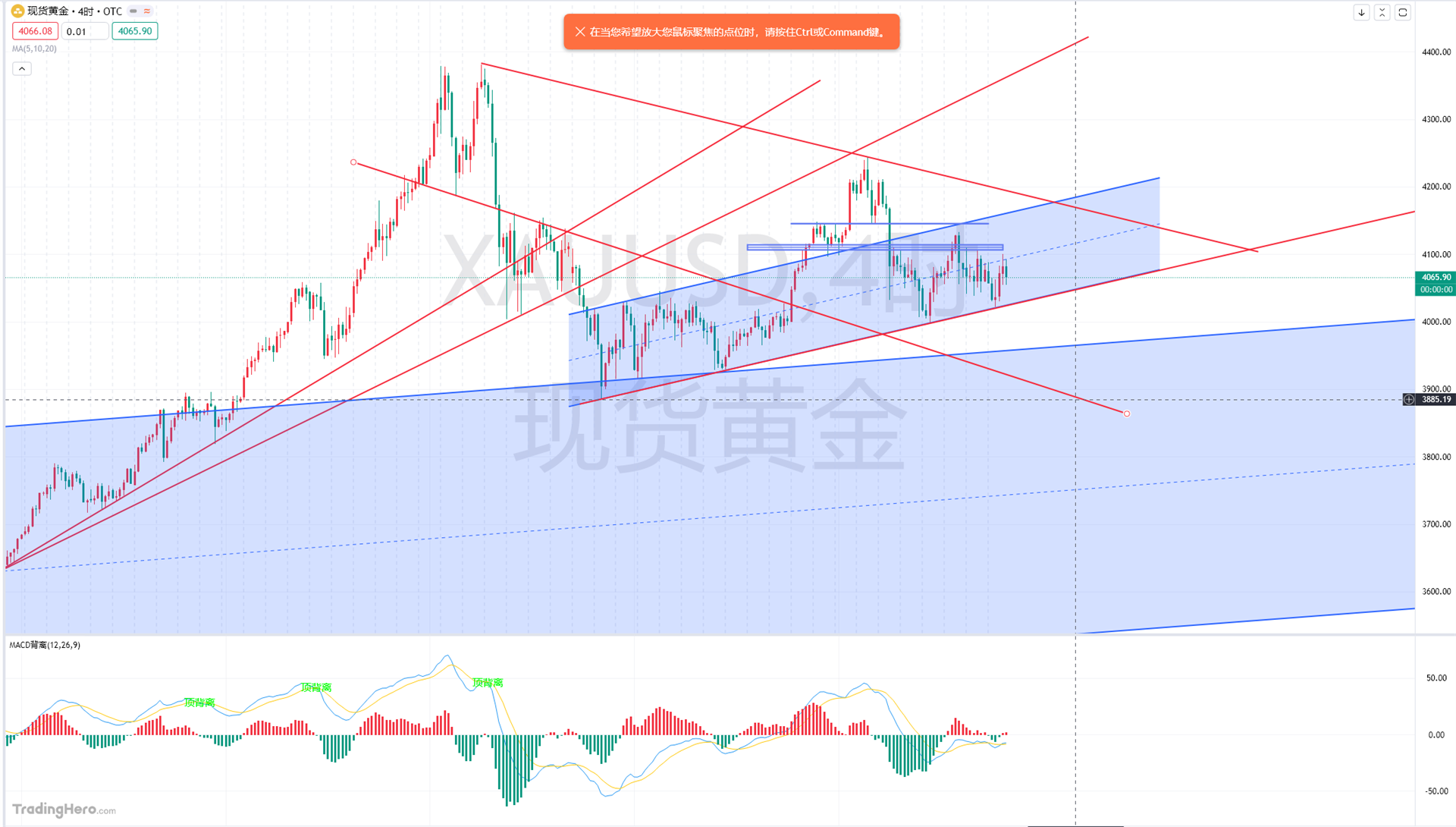 目前所有周期都显示震荡偏弱走势,当然我们得逢高做空为主。而我们本周目前关注的就是两点支撑4022-3997一线,不破价格还是以震荡走势为主;跌破价格二次向下试探前期低点3890-3900一线。