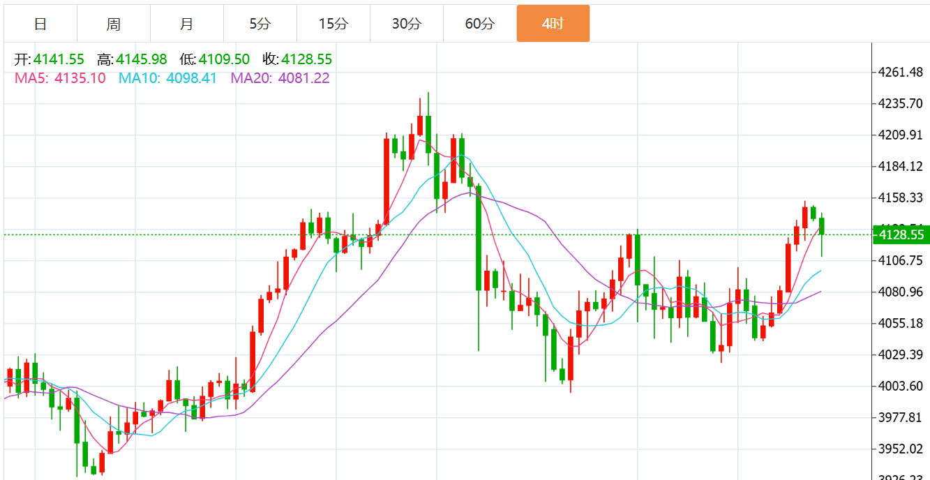 黄金技术面分析:黄金昨晚美盘地缘避险支撑黄金上涨,美联储降息预期概率提升至八成,黄金向上形成支撑,黄金已经有效突破站稳4100一线,日线收大阳。昨日欧盘在次低点4040做了w底,企稳后上涨。仔细观察这段时间行情,都是做出w底上涨。由于昨日强势收盘,今日看惯性上涨,关注日内回调做多机会,预计回调4110-4100附近关注做多机会。上方强压力位于4180-4200附近,即三角形上轨区域。今日方面,形成了早间上升的格局,这就出现分化点,早间低点后上升,这种走势中,分水岭早间低点,按照双双原则,分水岭不能破。所以,继续看涨,那么午后调整的幅度不会过大,太大就变形了。按照小时线大阳来说,今日日内做多的位置在4110-4100一线。综合来看,今日黄金短线操作思路上贺博生建议回调做多为主,反弹做空为辅,上方短期重点关注4155-4175一线阻力,下方短期重点关注4110-4090一线支撑。
