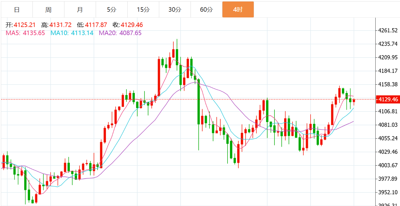 黄金技术面分析:黄金昨晚美盘地缘避险支撑黄金上涨,美联储降息预期概率提升至八成,黄金向上形成支撑,黄金已经有效突破站稳4100一线,日线收大阳。昨日欧盘在次低点4040做了w底,企稳后上涨。仔细观察这段时间行情,都是做出w底上涨。由于昨日强势收盘,今日看惯性上涨,关注日内回调做多机会,预计回调4110-4100附近关注做多机会。上方强压力位于4180-4200附近,即三角形上轨区域。今日方面,形成了早间上升的格局,这就出现分化点,早间低点后上升,这种走势中,分水岭早间低点,按照双双原则,分水岭不能破。所以,继续看涨,那么午后调整的幅度不会过大,太大就变形了。按照小时线大阳来说,今日日内做多的位置在4110-4100一线。综合来看,今日黄金短线操作思路上贺博生建议回调做多为主,反弹做空为辅,上方短期重点关注4150-4170一线阻力,下方短期重点关注4100-4080一线支撑。