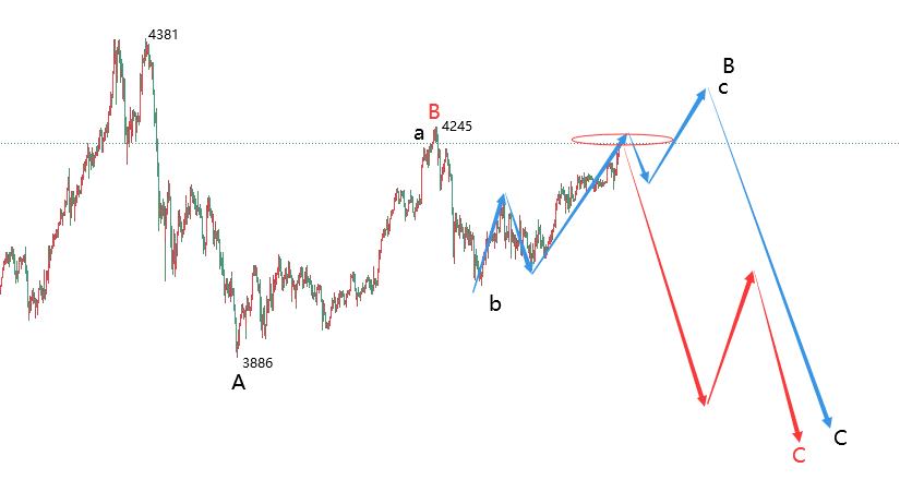 周五感恩节没想到行情这么大,早盘开盘之后就直接上冲突破高点到达4193一线,欧盘回落后美盘强势反弹上涨,由于美盘提前休市但是行情确实一路上涨突破,最高上涨至4226一线,已经突破了11月14日的高位压力,那么下一步就看4245-4250的阻力区域了。破位看B浪C,不破看C浪3下跌。