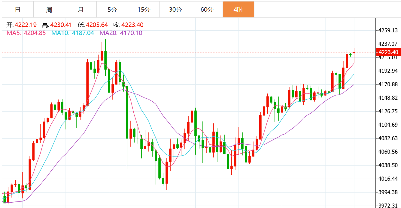黄金技术面分析:上周五感恩节没想到行情这么大,早盘开盘之后就直接上冲突破高点到达4193一线,欧盘回落后美盘强势反弹上涨,由于美盘提前休市但是行情确实一路上涨突破,最高上涨至4226一线,已经突破了11月14日的高位压力,那么下一步就看4245-4250的阻力区域了。破位看B浪C,不破看C浪3下跌。金价上周探底回升,目前已转阳偏强,短期10均线对其产生买盘支撑,但上方趋势线压力仍在对其产生动力限制,进一步走高仍需突破于此,突破将进一步上看历史高点4381美元,下方则继续关注10均线4040美元附近,跌破将进一步看至4000美元附近。日线级别:金价上周再度稳于20日均线上方震荡偏涨,但趋势线仍在产生部分压力,附图指标KDJ动力减弱,MACD动能柱有持续缩减预期,因而不排除走高后再度回落的风险,但布林带正处于缩减横向发展,金价又运行在中轨上方,暗示较大方向,将是向上走高,但短期的承压仍不能排除,在突破5日均线持稳前,行情料将保持在中轨上方震荡横向整理,之后则再度连续走高反弹。