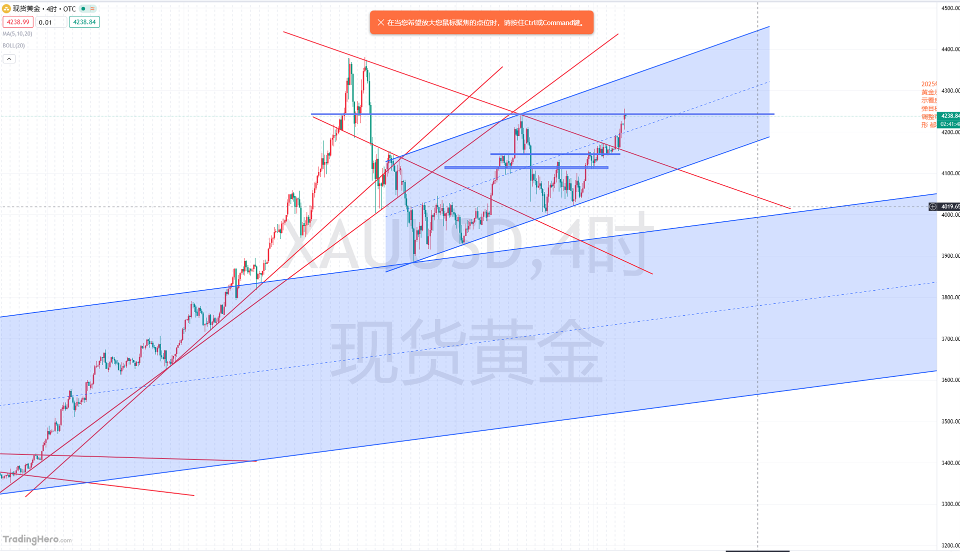 因为4小时已经突破了前期的高点4245一线,因此上方的阻力变成4275-4315-4357附近。所以我们再次空得等到4275附近,而多单位置位于4210-12附近。