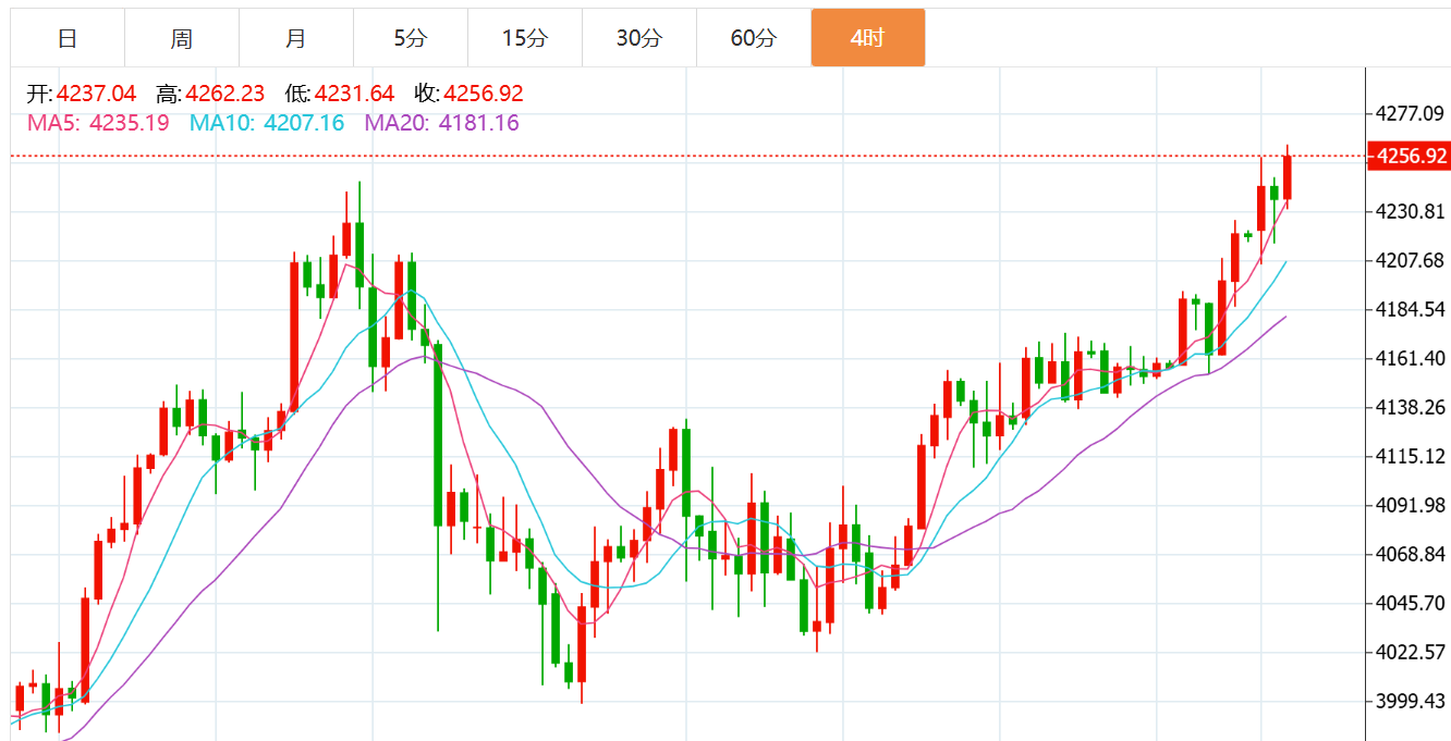 黄金技术面分析:从技术面来看,黄金周线回踩10周均线支撑再次反弹,上周收一根实体中阳线,带动5周均线重新向上发散,本周金价格有望延续上涨,短期上方关注4245一线阻力,一旦突破4245一线则有望继续挑战前高4381.所以当前黄金操作上以回踩做多为主,日线级别来看,黄金回踩刺破中轨支撑并未延续下跌,而是逐渐震荡上涨,价格依托5日均线持续反弹,目前价格已刺破前高4245一线,说明行情处于强势之中,短期黄金依托5日均线4180继续看涨,4小时级别黄金上周突破三角收敛区间上沿线,那么短期来看黄金还会惯性走出一波上涨,黄金周初行情看涨为主,交易尽量做低多,小周期下方支撑在4205.4180.上方则关注4255.4300-4355.综合来看,今日黄金短线操作思路上贺博生建议以回调做多为主,反弹高空为辅,上方短期重点关注4275-4295一线阻力,下方短期重点关注4230-4210一线支撑。
