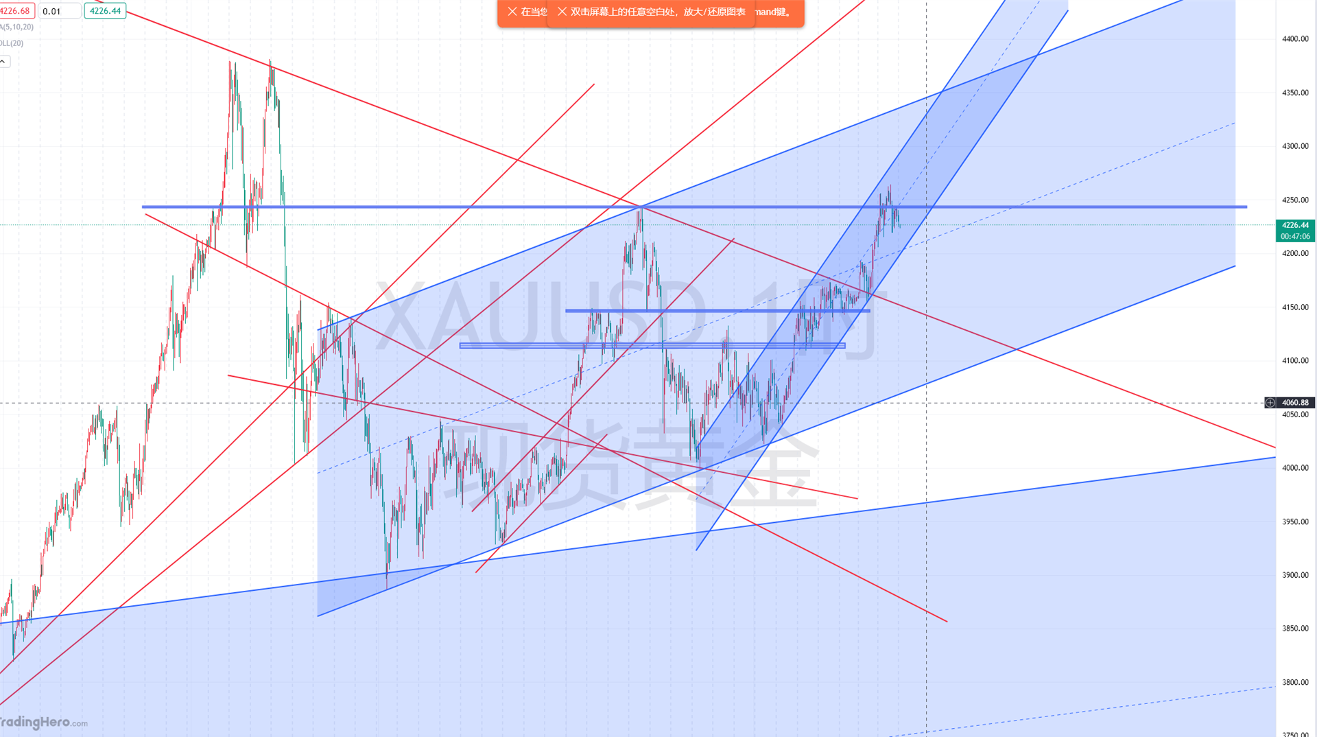 第二,现货黄金日线级别:上周五收报大阳,算有效突破站上了小收敛三角上轨,今日有所延续拉升,不过这并不代表这轮拉升已经是牛市单边启动了,可能是存在,均线现在也似乎是多头排列,但仍需留意一个心眼,毕竟离12月11日,12月16日等重要数据公布还有两周左右时间,再结合上一次4个月时间的收敛盘整规律,也大可能存在进一步的宽幅整理,只是把小收敛三角扩大为一个新的大收敛三角,而本周初就是耐心等大收敛三角的第二承压节点出现,关注4275或4325,也可能两个位置之间或附近;只要出现日线承压K,且第二日,第三日延续震荡下跌了,力度有所打开了,那么第二节点才能确认,然后大收敛三角的上轨趋势线就基本成立,后市只要再二次突破收盘三角上轨且有效站上,就真的是大牛市趋势的强势单边回归;若出现承压K了,则后续震荡回踩可以至少确认下前期小收敛三角的上轨趋势线,也不排除把下轨趋势线被击穿,从而引出大收敛三角的下轨趋势线,这需一步步来;