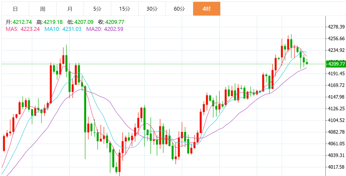 黄金技术面分析:黄金昨日早盘时段延续一波情绪化上涨,随后行情回撤调整,欧盘时段震荡回弹,高点测压至4265附近,但随后行情出现调整回修,低点跌回至4220附近,日线最终收得一阳十字星线。日线结构上来看,黄金日均线系统依然保持着多头排列状态,说明市场主体意愿还是偏向于看涨的,但是昨日十字星也透露出多头动能不足的端倪,这种现象是两方面因素导致的:一是前期连续多日震荡上涨,多头动能已经消耗,技术上也有回修调整的需要;二是基本面炒作美联储降息预期热度有所降低,没有后续的利多刺激,多头也很难获得持续的上涨动力,出现调整也就在所难免。今日早间黄金出现一波快速回撤,回撤4200下方,但尚未破5日线,不过这样的举动已经透露当前黄金还是需要进行合理性的修整的。日内下方继续先关注5日线4200-4195一带争夺,如果有跌破,则短期内下方或可能去10日线4150附近找支撑。日内上方则继续关注日线级别区间上沿压力4260-65附近,但在此之前,昨日收盘位4230-35附近亦有可能一定的阻力。