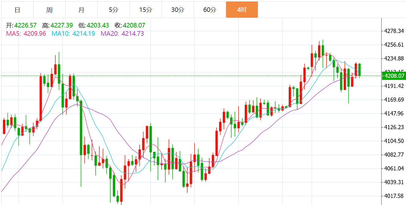 黄金4小时级别布林带收口中,昨夜黄金探回升,今日早盘延续上涨,目前K线连阳回升至中轨上方,ma5拐头向上与ma10粘合于中轨,暂时参考意义不大,涨跌大概率都在上下轨区间内,大区间在4260-4150.此区间不破,也难以走出多空的延续以及空头的反扑。对于交易而言,今天先关注周二的高点4235的*效果,此点位不破可以尝试做空,看下方的支撑点4180.4150得失,关键点不破也可以顺势做多,再看上涨空间。综合来看,今日黄金短线操作思路上贺博生建议以反弹高空为主,回踩低多为辅,上方短期重点关注4230-4250一线阻力,下方短期重点关注4190-4170一线支撑。