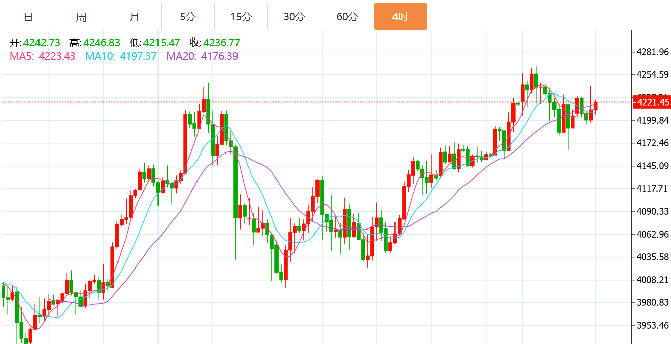黄金4小时级别布林带收口中,昨夜黄金探回升,今日早盘延续上涨,目前K线连阳回升至中轨上方,ma5拐头向上与ma10粘合于中轨,暂时参考意义不大,涨跌大概率都在上下轨区间内,大区间在4260-4150.此区间不破,也难以走出多空的延续以及空头的反扑。对于交易而言,今天先关注周二的高点4235的*效果,此点位不破可以尝试做空,看下方的支撑点4180.4150得失,关键点不破也可以顺势做多,再看上涨空间。综合来看,今日黄金短线操作思路上贺博生建议以反弹高空为主,回踩低多为辅,上方短期重点关注4240-4260一线阻力,下方短期重点关注4200-4180一线支撑。
