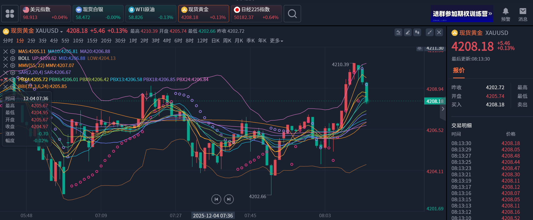周三(12月3日)北京时间21:15,美国ADP就业报告公布,私营部门11月新增就业岗位减少3.2万个,远低于市场预期。数据公布后,市场对美联储降息的预期显著上升,美元指数短线下挫约8个点,现货黄金短线拉升近10美元/盎司。投资者关注这一数据对宏观政策路径的影响。最高报4221.25美元/盎司。避险情绪主导盘中走势,投资者关注这一数据对宏观政策路径的影响。11月劳动力市场已有冷却迹象,虽然每周失业救济申请人数下降,但消费者调查中“就业难觅”的比例上升,小企业就业指数仅微幅改善。ADP负增长与此趋势一致,也与近期美联储官员关于“就业下行风险上升,通胀压力减弱”的表态相符。机构分析认为,尽管美联储内部可能出现较多异议,但鸽派立场已占上风。同时,近期生产者价格指数(PPI)核心值回落至2.6%,低于预期,通胀趋稳为美联储提供了更多政策空间。市场逻辑清晰:就业疲软强化了美联储支持就业的职责,同时通胀顾虑减轻,促使资金从美元流向黄金和债券。