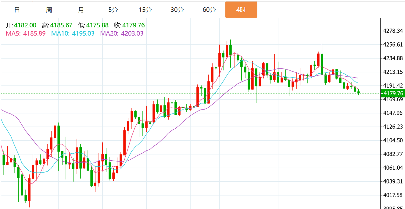 黄金4小时级别走势上价格跌破短期的支撑带,K线开始逐步承压短周期均线维持震荡偏弱一些走势,短期关注小幅反弹修复之后的二次下跌走势。黄金4小时级别走势背离,昨日连续四次承压在4220位置不过后行情回落,最近一直维持着4175-4220的区间,但本周的反弹高点都是逐步降低,由此可见多头上攻意愿较弱,已经不同于此前的暴涨行情,当前仍是维持一个震荡走势!小时级别走势上在连续的震荡之后技术形态有逐步修复的意思,短周期均线开始逐步勾头向上短线可能有些反弹的空间,关注下短线的反弹修复情况。黄金当前下方依然关注4150区域的支撑,不过上方短线阻力关注4200附近的*,如果早盘承压4200,那么还是可以高空,下方4160获得支撑,短线可以看一波反弹。综合来看,今日黄金短线操作思路上贺博生建议反弹做空为主,回调做多为辅,上方短期重点关注4200-4220一线阻力,下方短期重点关注4160-4140一线支撑。