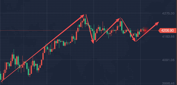 周三黄金以看涨为主。周二金价探底回升,四小时线收出长下影,显示区间底部支撑依然有力。今日可围绕四小时级别的反弹势能看涨。方向明确后,可寻找有效支撑分批布局多单。当前价格仍在区间内震荡,日内可重点关注日线级别5-10日均线支撑4200附近,其下4190为凌晨回撤低点,也是上涨结构的核心防守位。可锁定4200-4190区域作为支撑带观察企稳信号,若跌破则转为观望。