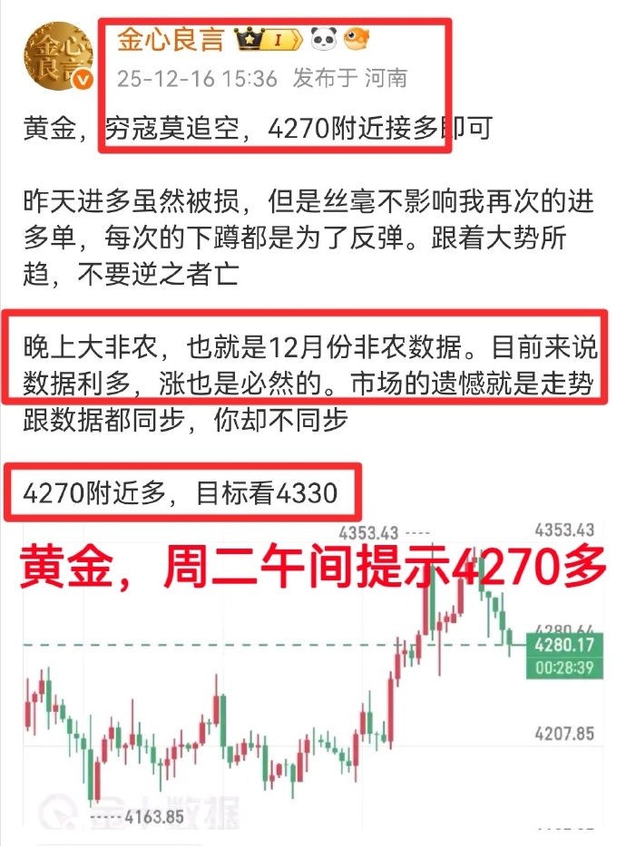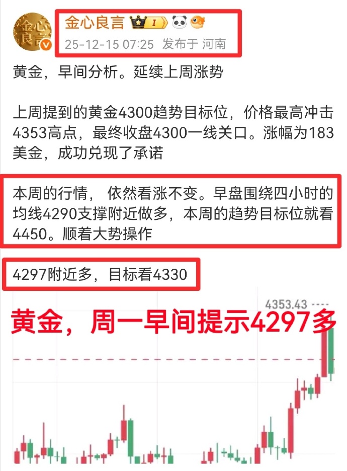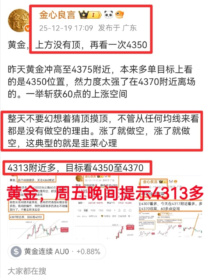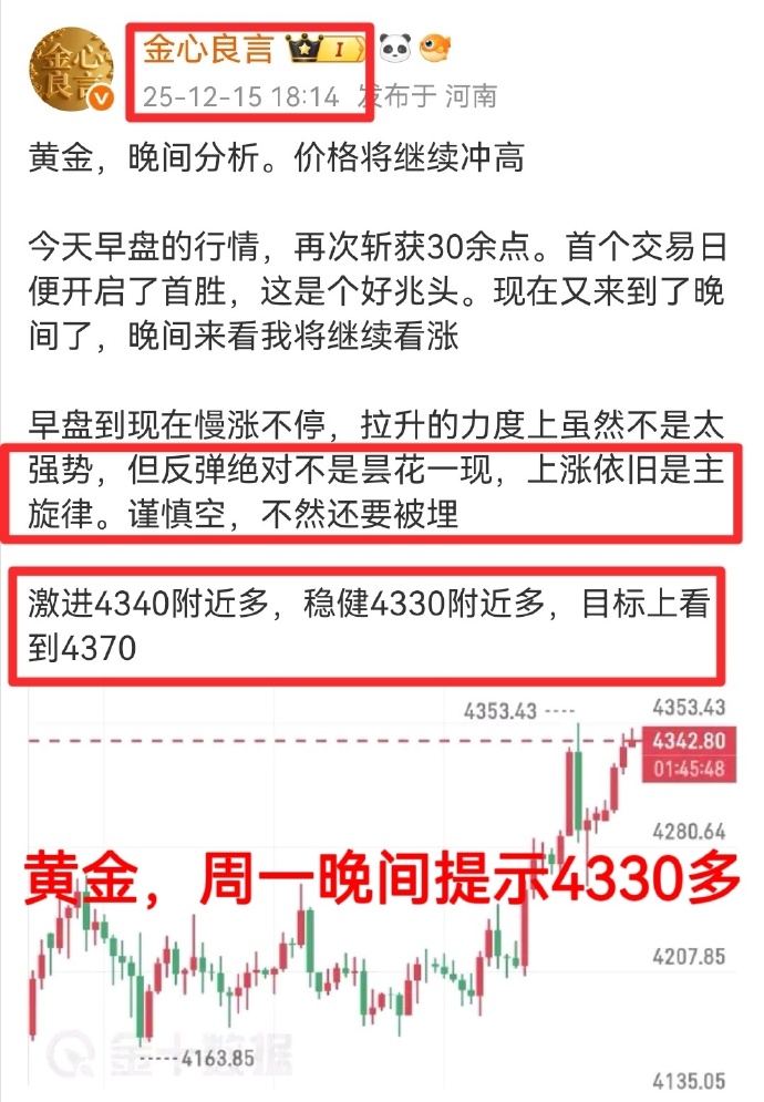 这周的布局和上周的布局一样精准,五天交易日都在唱多、做多、干多,黄金目标多次提示看到4350、4370