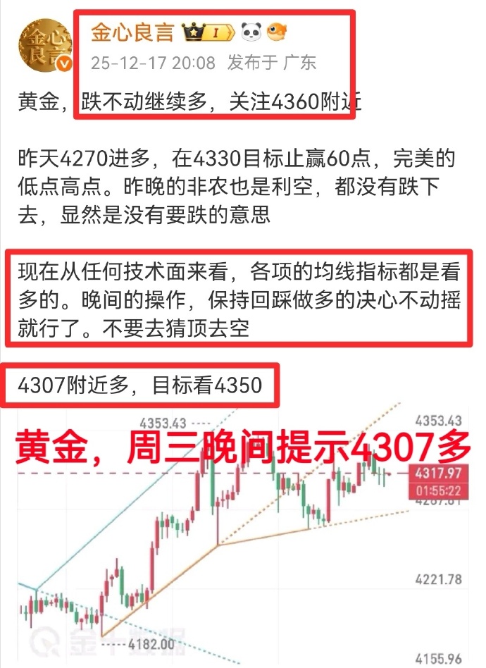 本周黄金在涨,我一直提示多。多次提示目标看到4350和4370