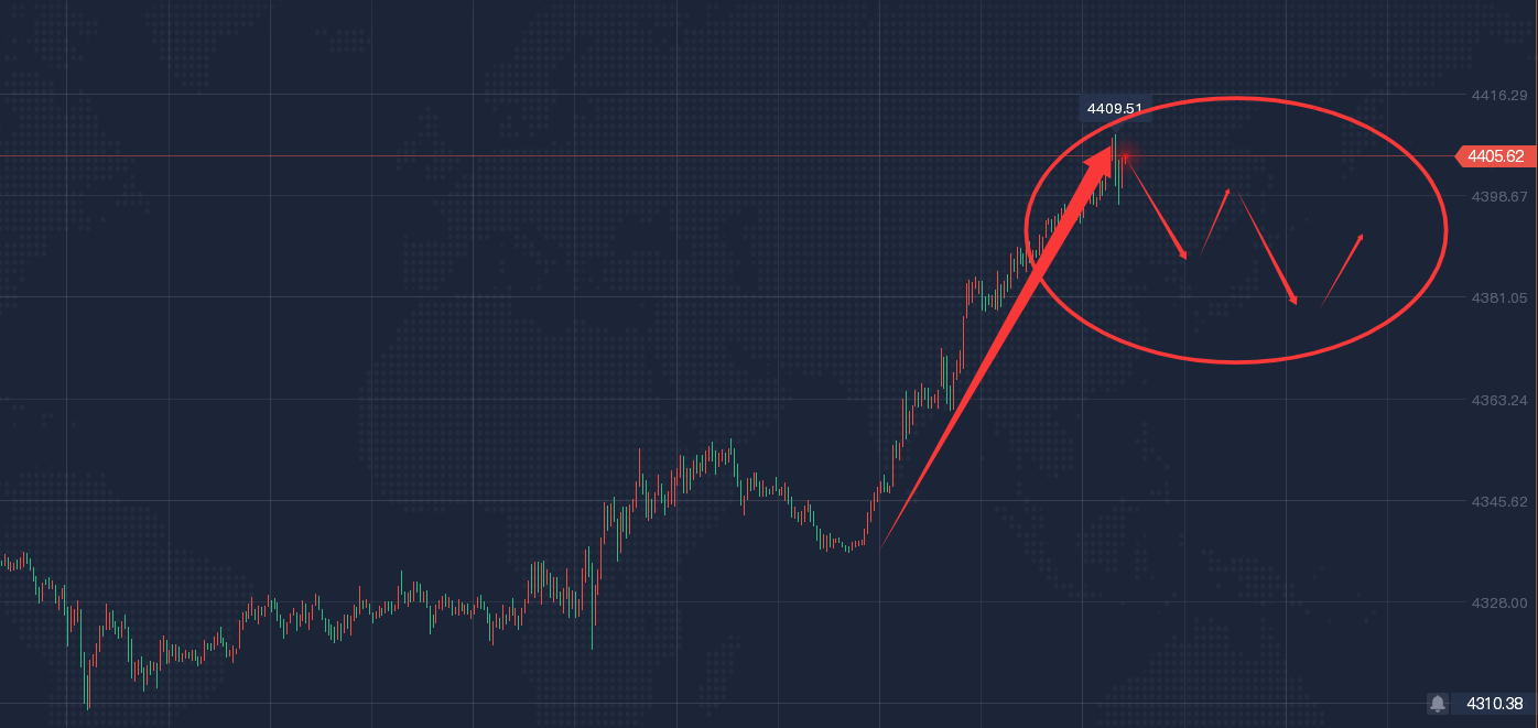 短线,日内关注回踩4370——4375附近的二次多机会,早盘直接破高,欧盘一旦回撤,还有二次冲高的机会,所以短线依托上周五高点附近顶底转换位置做日内多,拉高之后择高离场,这个位置,只能短线去参与。波段,仍然要谨防近期出现大幅回撤,一旦再次回撤至4300下方,中线波段和择低分批入场。
